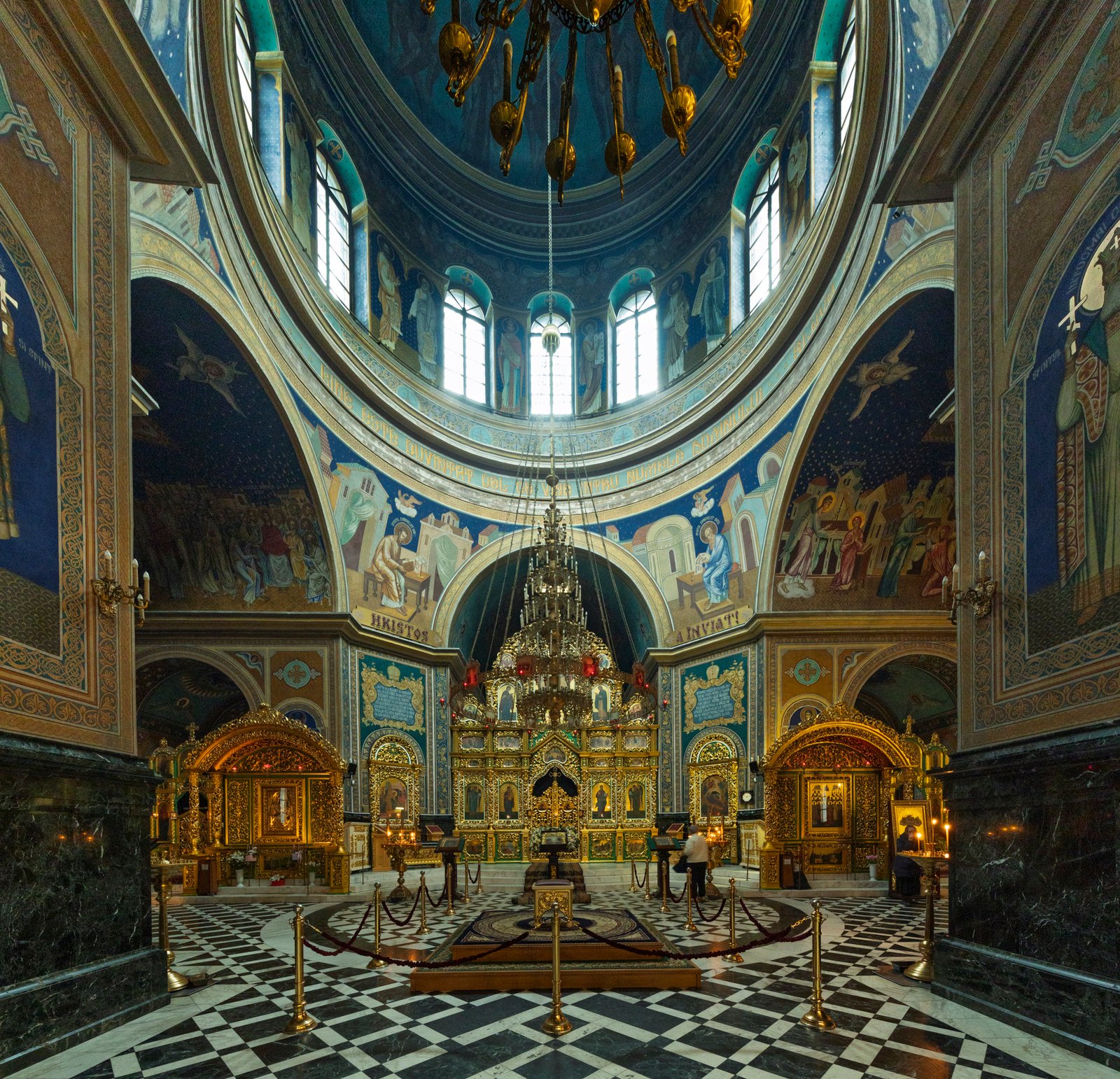 Architecturally, the cathedral is a prime example of Neoclassical design, characterized by its symmetry, simplicity, and grandeur. Its exterior features a large central dome, symbolizing the heavens, supported by a rectangular base. The entrance is marked by a prominent portico with six Ionic columns, giving it a stately and elegant appearance. The cathedral's bell tower, originally built separately from the main structure, was destroyed during World War II but was reconstructed in the early 2000s to restore the integrity of the original layout. Inside, the cathedral is adorned with frescoes, chandeliers, and a richly decorated iconostasis, reflecting traditional Orthodox Christian artistic influences.