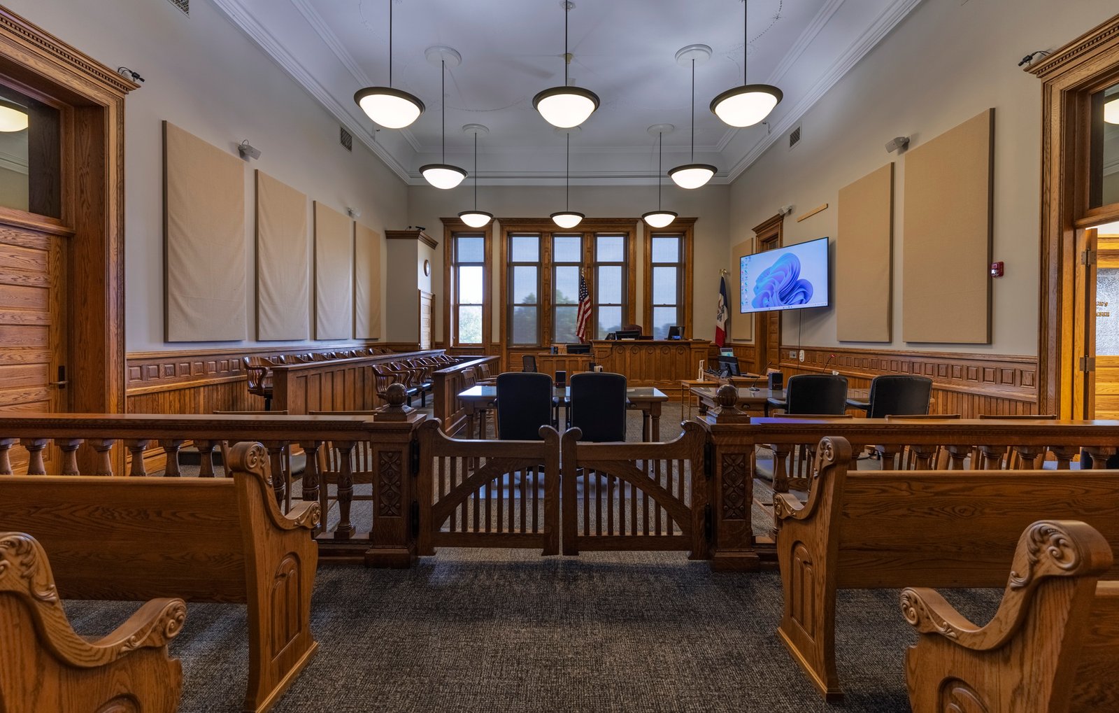 8 The Iowa County Courthouse in Marengo was completed in 1893 as the fourth courthouse for the county; its predecessors—a log structure, a stone building, and a brick courthouse—proved inadequate as the population grew. It cost about $57,600 to build, much of that raised by auctioning off swamp lands the county owned. The courthouse is a Romanesque Revival building designed by the Des Moines firm Foster & Liebbe, built of Berea sandstone, and is distinguished by a commanding 137-foot entrance tower capped with an octagonal lantern and steep spire. Inside it features two stories with antique oak finishes, fire-proof vaults for official records, steam heating, and early electric lighting, reflecting late 19th-century civic ambitions.