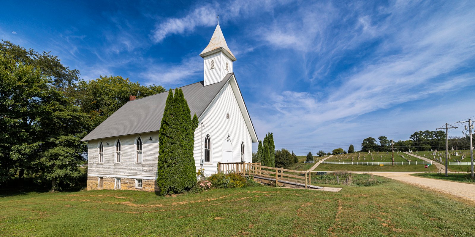 7 The Buckhorn Church, located near Maquoketa in Jackson County, Iowa, is one of the few remaining landmarks of the once-bustling rural community of Buckhorn. Established in the late 19th or early 20th century, the church served as a spiritual and social center for the area’s farming families, who also supported a thriving creamery and small businesses. The simple white wooden structure, complete with a modest steeple and traditional clapboard siding, reflects the unadorned yet enduring character of Midwestern rural church architecture.