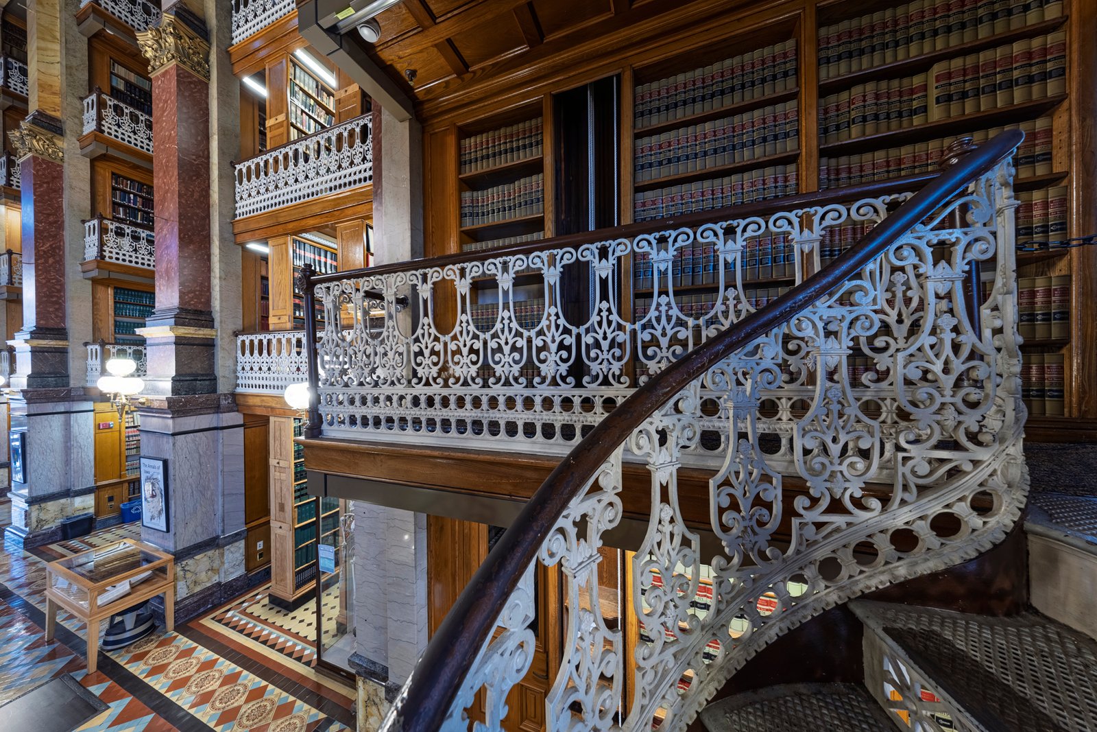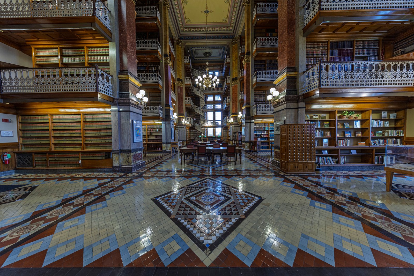 18 The State Law Library inside the Iowa State Capitol is one of the building’s most celebrated interior spaces, renowned for both its history and architectural beauty. Established alongside the Capitol’s completion in the 1880s, the library reflects the grandeur of the era with its Victorian design, featuring four tiers of cast-iron spiral staircases, ornamental railings, and balconies that rise dramatically around the reading room. Its tall arched windows flood the space with natural light, highlighting the marble floors, richly carved woodwork, and decorative details that emphasize elegance and craftsmanship.