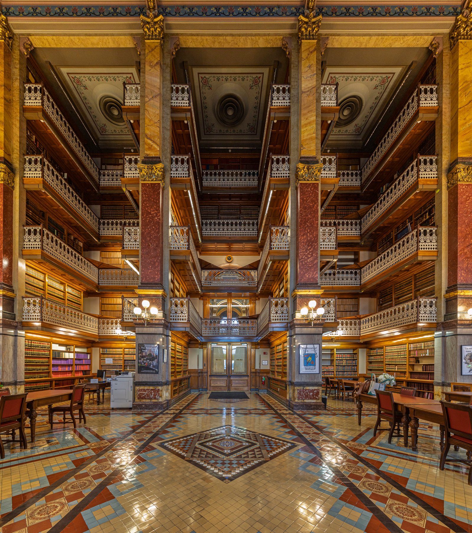 17 The State Law Library inside the Iowa State Capitol is one of the building’s most celebrated interior spaces, renowned for both its history and architectural beauty. Established alongside the Capitol’s completion in the 1880s, the library reflects the grandeur of the era with its Victorian design, featuring four tiers of cast-iron spiral staircases, ornamental railings, and balconies that rise dramatically around the reading room. Its tall arched windows flood the space with natural light, highlighting the marble floors, richly carved woodwork, and decorative details that emphasize elegance and craftsmanship.