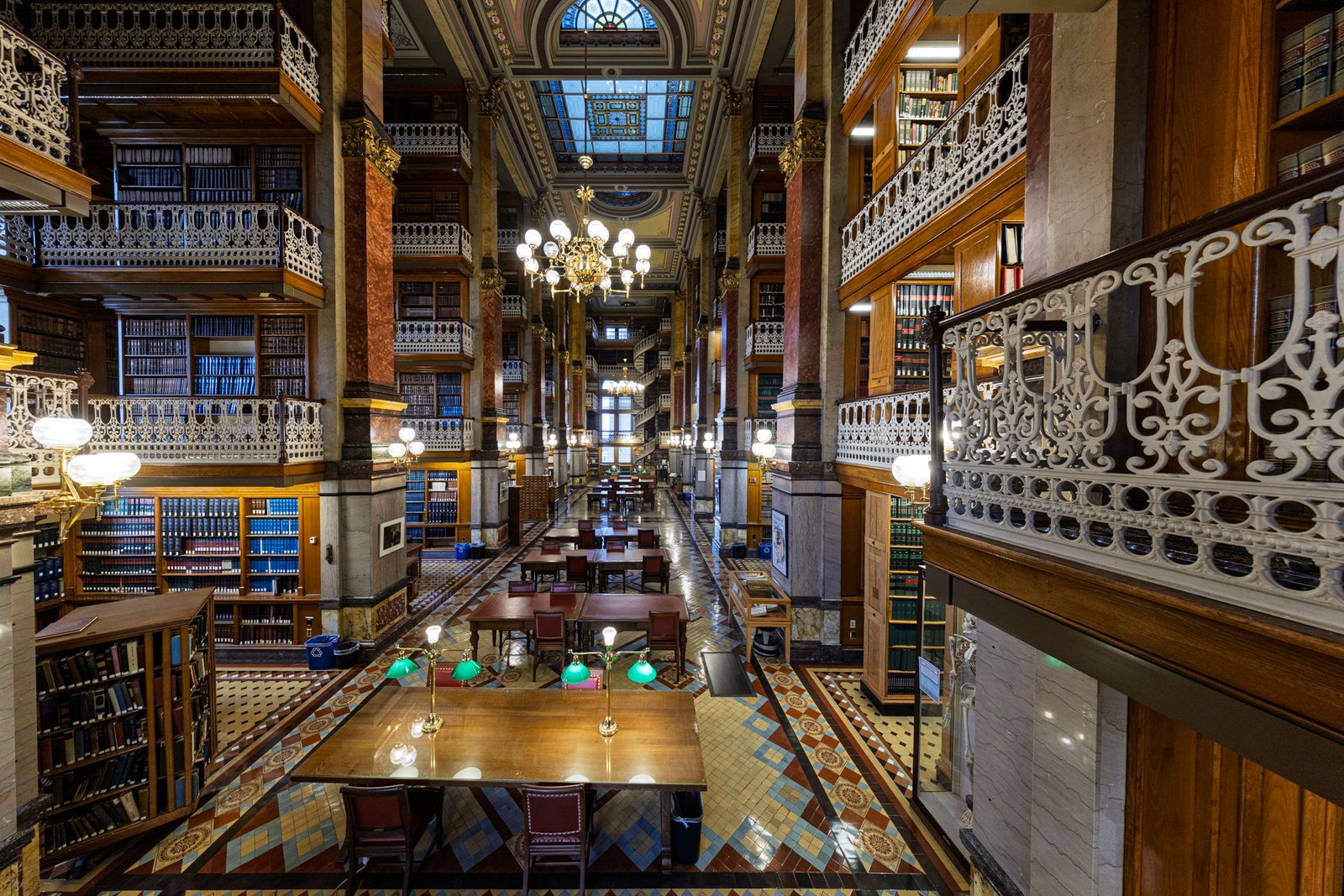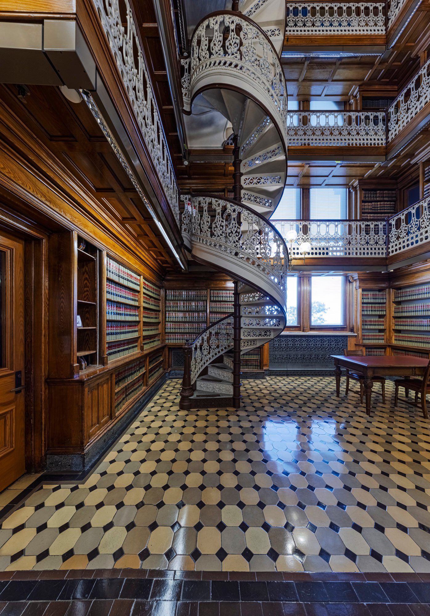 16 The State Law Library inside the Iowa State Capitol is one of the building’s most celebrated interior spaces, renowned for both its history and architectural beauty. Established alongside the Capitol’s completion in the 1880s, the library reflects the grandeur of the era with its Victorian design, featuring four tiers of cast-iron spiral staircases, ornamental railings, and balconies that rise dramatically around the reading room. Its tall arched windows flood the space with natural light, highlighting the marble floors, richly carved woodwork, and decorative details that emphasize elegance and craftsmanship.