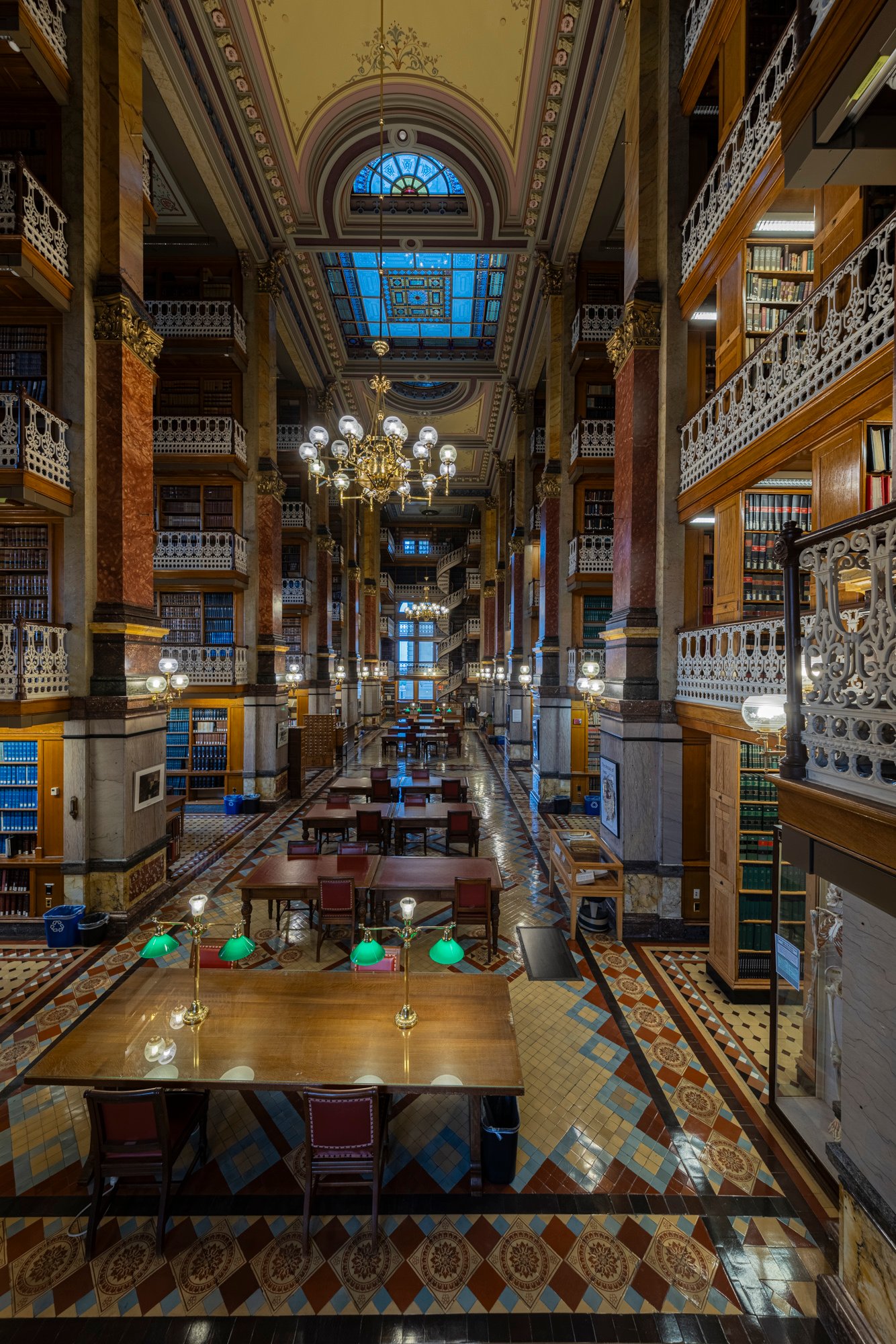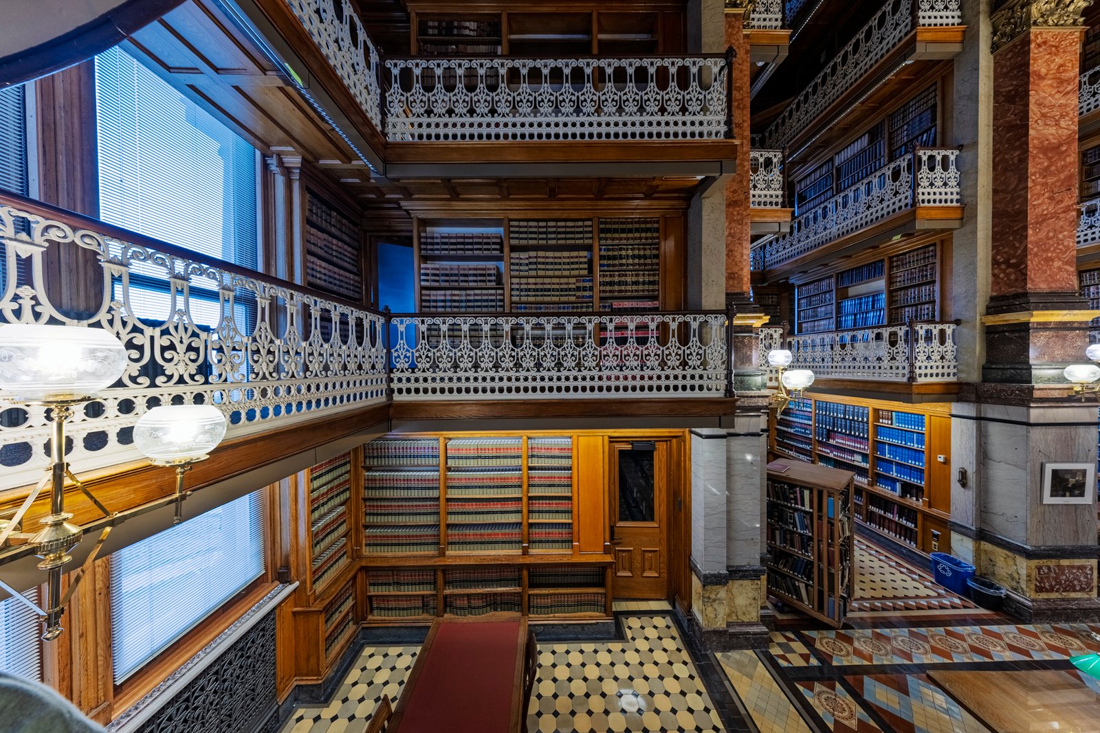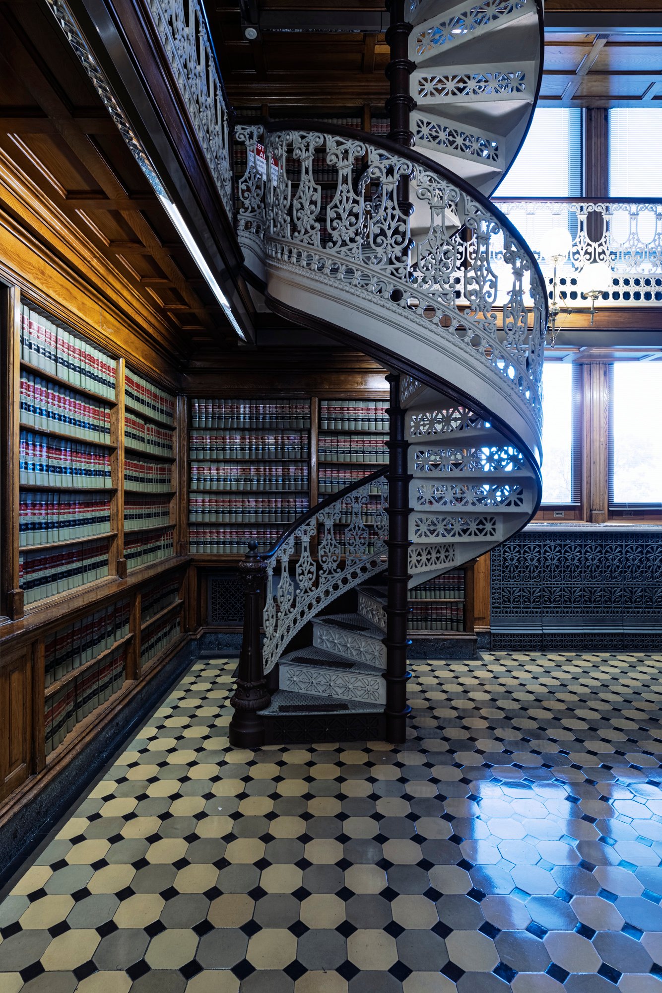 11 The State Law Library inside the Iowa State Capitol is one of the building’s most celebrated interior spaces, renowned for both its history and architectural beauty. Established alongside the Capitol’s completion in the 1880s, the library reflects the grandeur of the era with its Victorian design, featuring four tiers of cast-iron spiral staircases, ornamental railings, and balconies that rise dramatically around the reading room. Its tall arched windows flood the space with natural light, highlighting the marble floors, richly carved woodwork, and decorative details that emphasize elegance and craftsmanship.