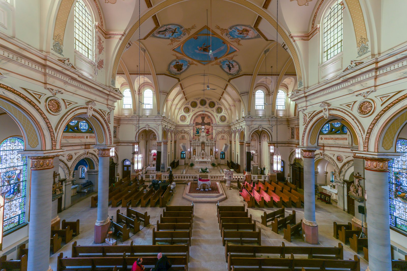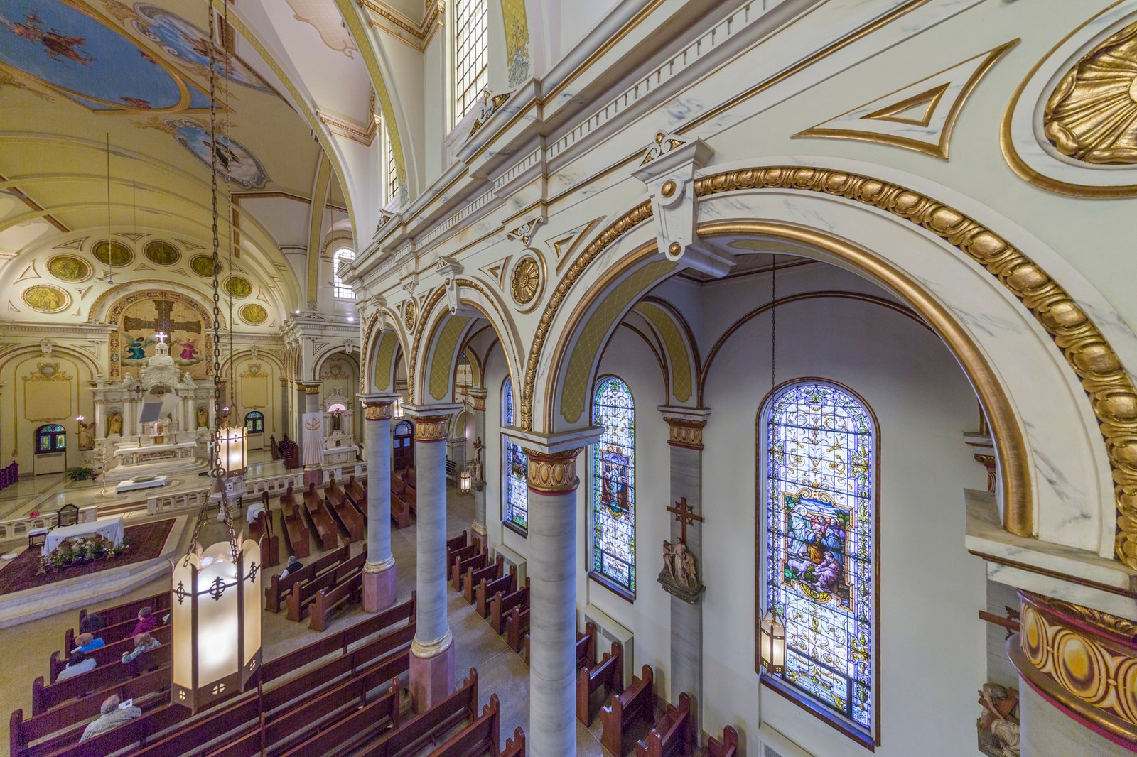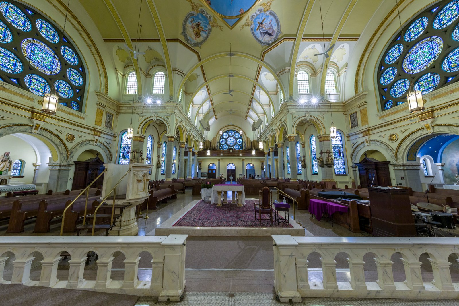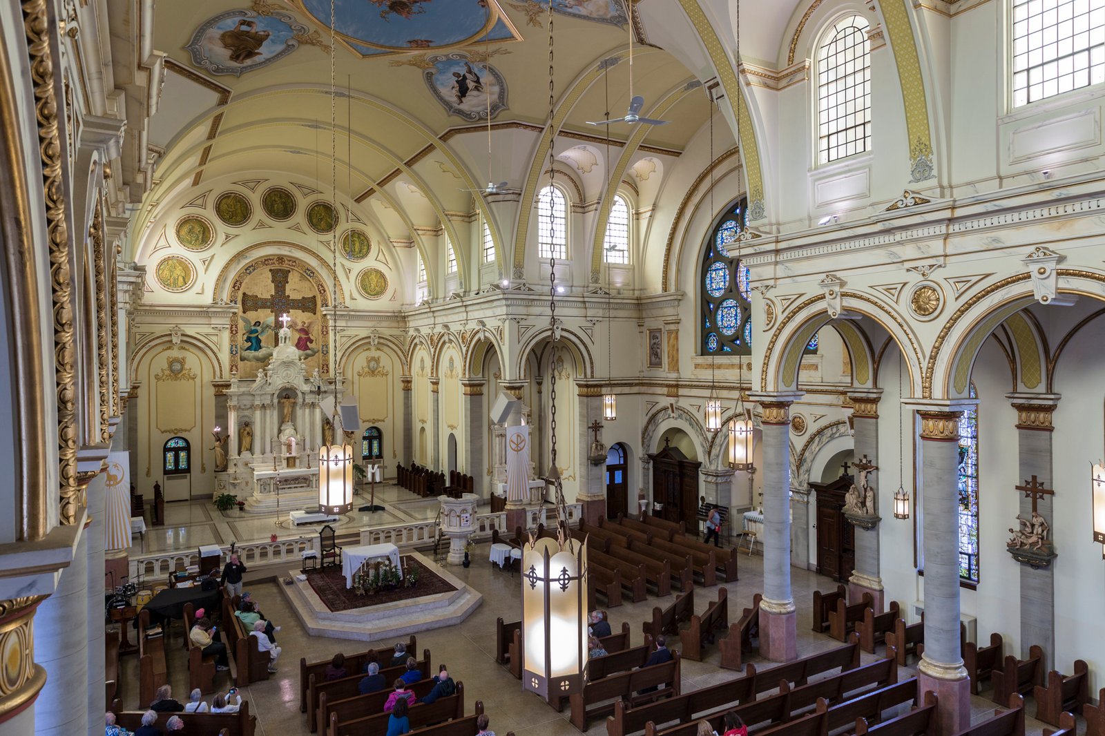 In the 1960's and 70's St. Charles, like many city parishes faced dwindling membership and struggled to survive. The school was closed and the building was eventually sold. In the 1980's St. Charles faced closure. This sad end was averted under the leadership of Father David Preuss, OFM, Capuchin. The small core of remaining parishioners banded together to implement roof repairs, boiler replacement, and began to rebuild their community. An ambitious project was undertaken to involve the parish in both neighborhood and church restoration. The church renovations included a total repainting of the interior in a style complimenting its design and adding several ceiling murals to represent the multi-ethnic community of the parish. Additional work in the church included lighting and electrical upgrades and maintaining the Wurlitzer pipe organ (one of only two of its type remaining in service). The parish was designated a Historic District on June 20, 1986 and was re-dedicated in November of 1995.