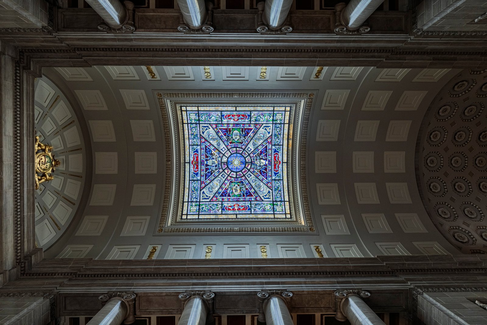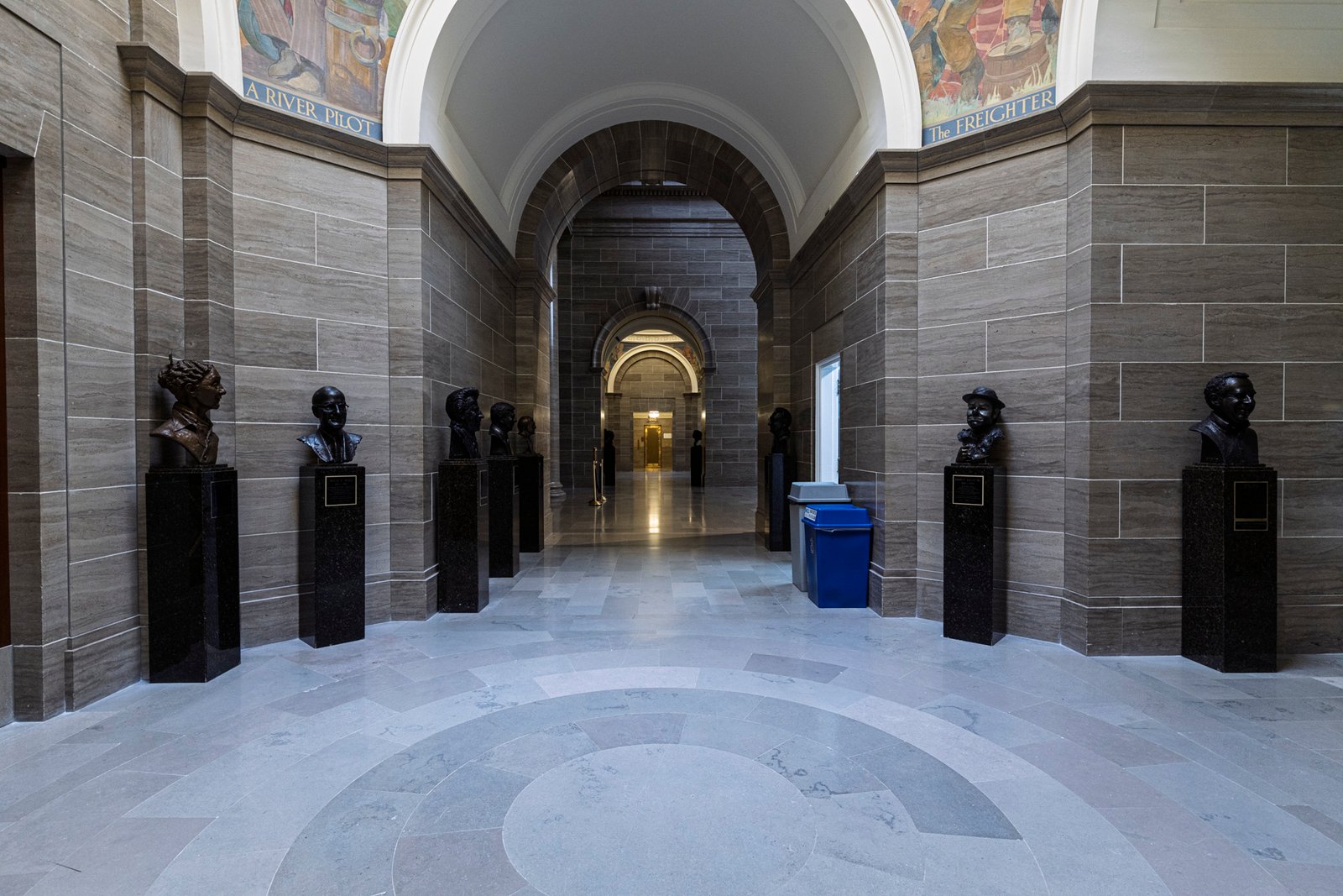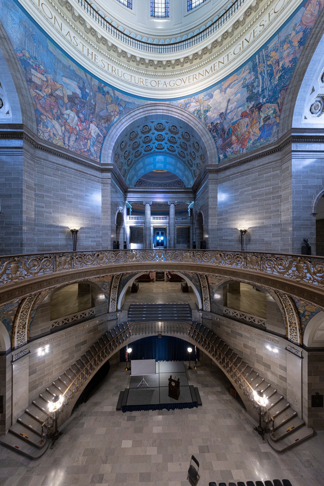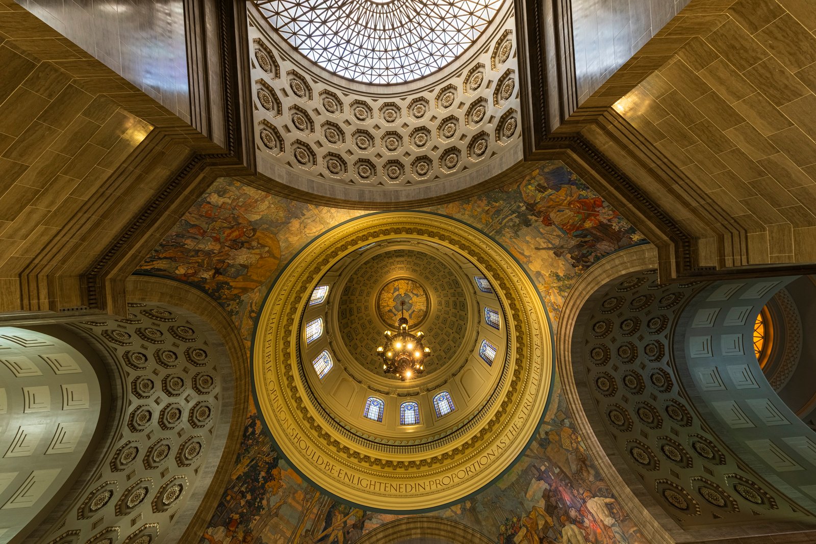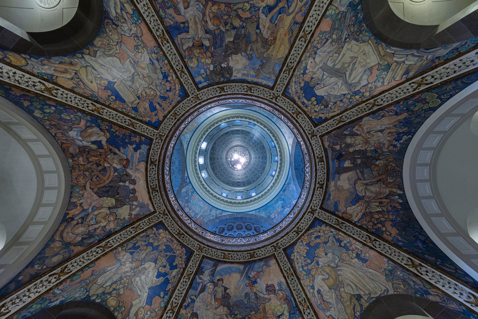 20 The Missouri State Capitol, located in Jefferson City, was completed in 1917 after the previous capitol was destroyed by fire in 1911. Constructed of Carthage marble and built at a cost of about $4 million, the Beaux-Arts style building was designed by the architectural firm Tracy and Swartwout of New York. The grand structure features a massive central dome rising 238 feet above the ground, adorned with a bronze statue of Ceres, the Roman goddess of agriculture. The interior is richly decorated with murals, sculptures, and mosaics celebrating Missouri’s history, culture, and natural beauty, including the renowned murals by Thomas Hart Benton. Overlooking the Missouri River