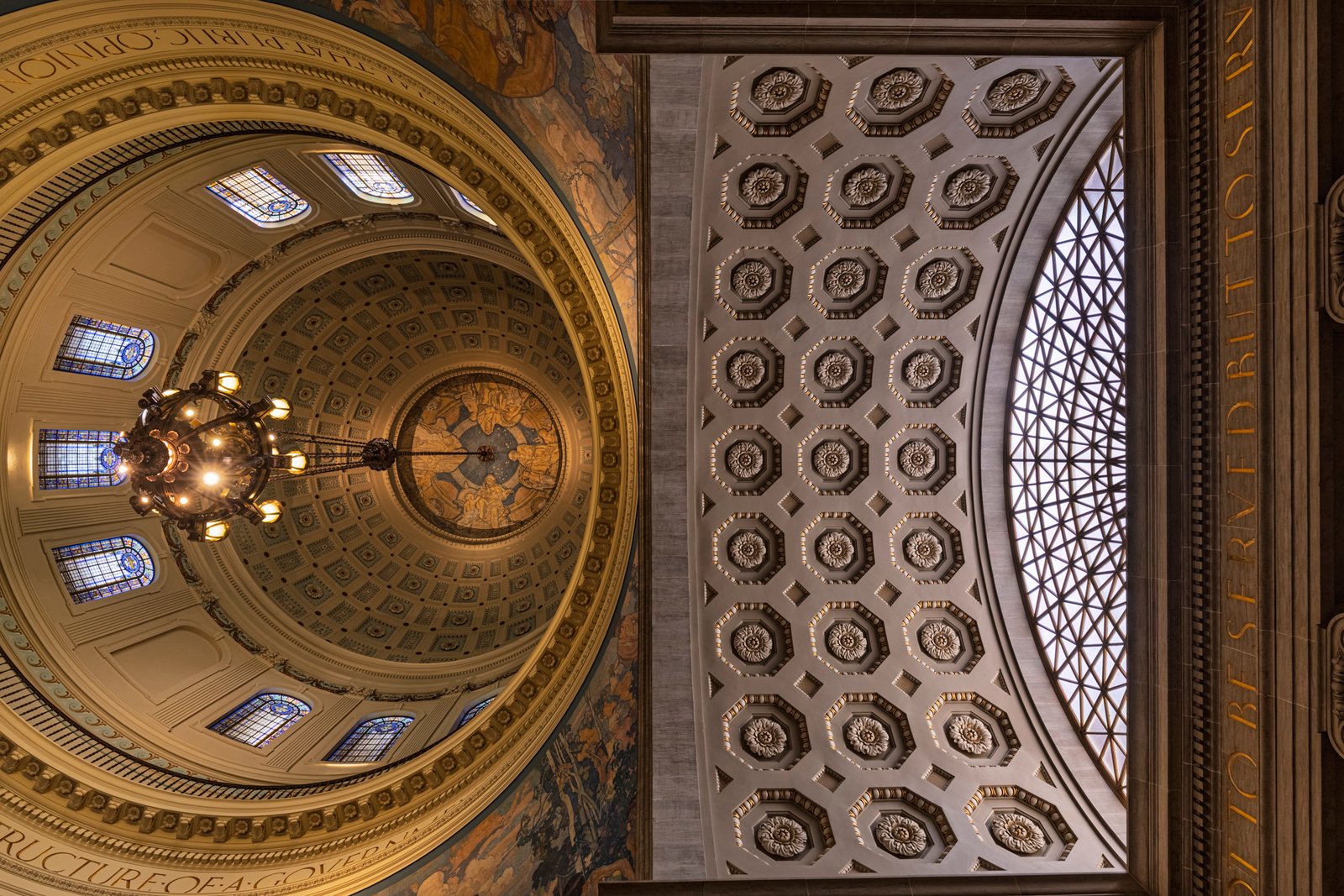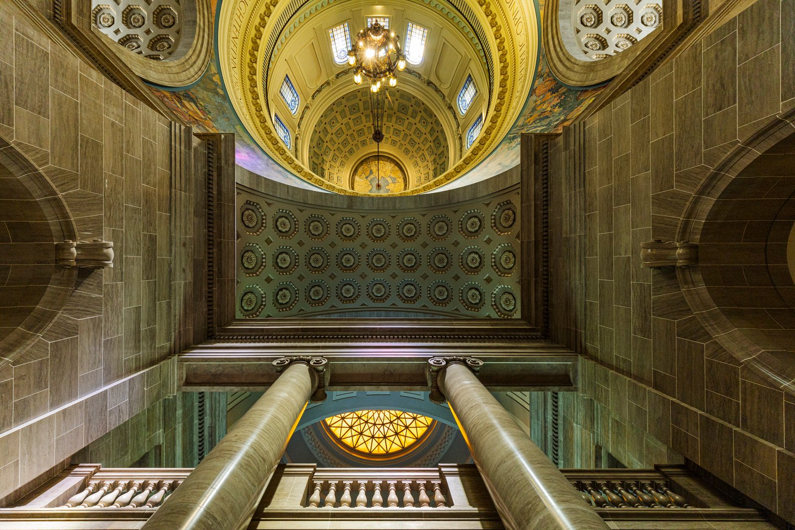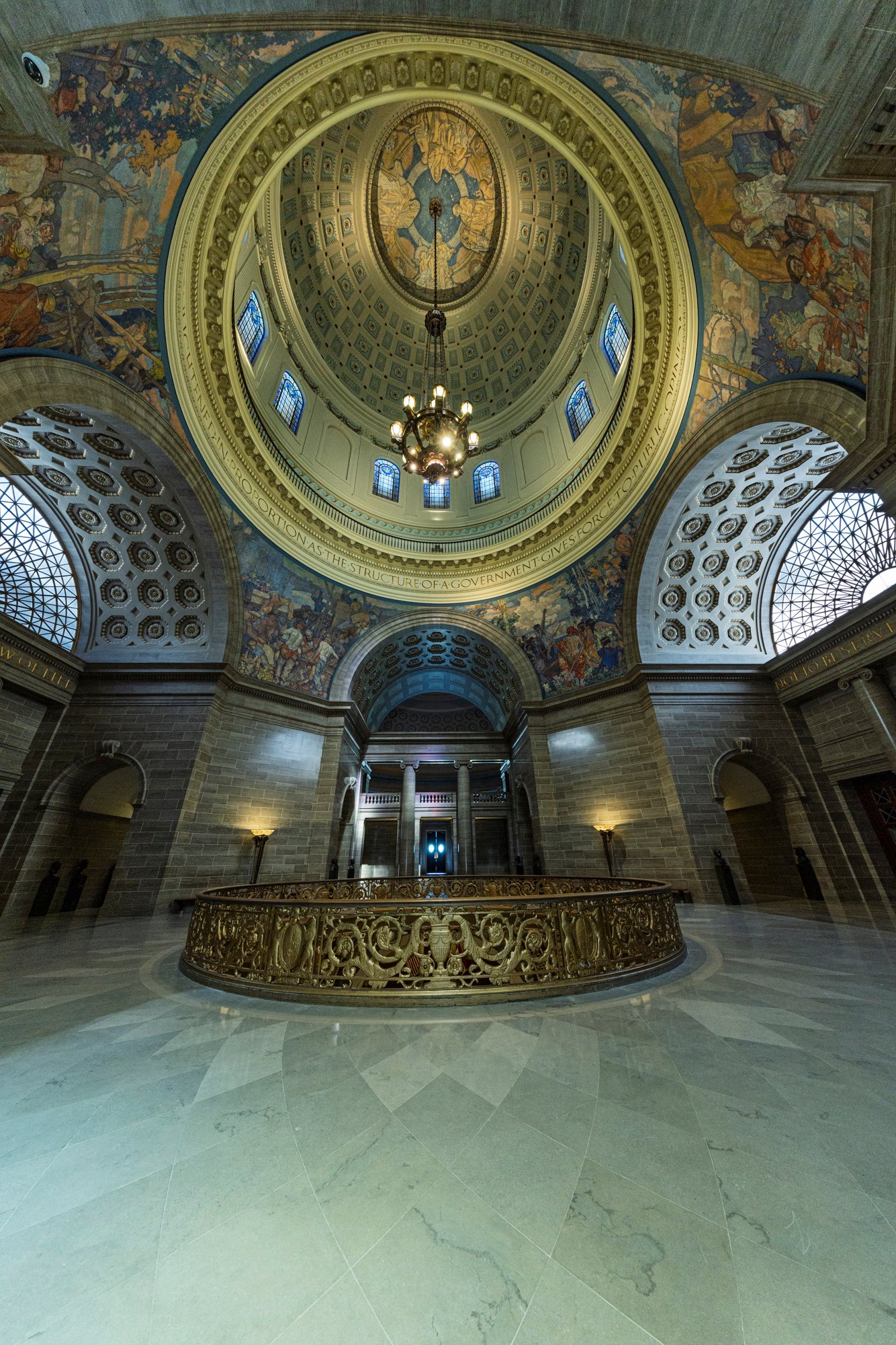 14 The Missouri State Capitol, located in Jefferson City, was completed in 1917 after the previous capitol was destroyed by fire in 1911. Constructed of Carthage marble and built at a cost of about $4 million, the Beaux-Arts style building was designed by the architectural firm Tracy and Swartwout of New York. The grand structure features a massive central dome rising 238 feet above the ground, adorned with a bronze statue of Ceres, the Roman goddess of agriculture. The interior is richly decorated with murals, sculptures, and mosaics celebrating Missouri’s history, culture, and natural beauty, including the renowned murals by Thomas Hart Benton. Overlooking the Missouri River