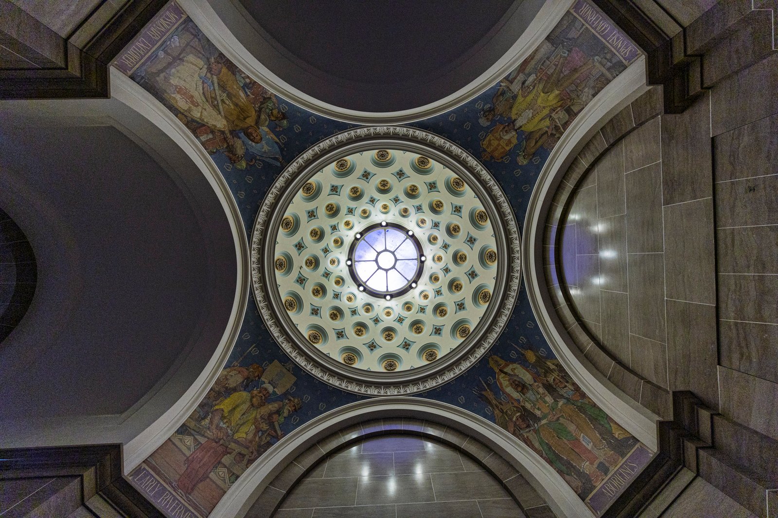 16 The Missouri State Capitol, located in Jefferson City, was completed in 1917 after the previous capitol was destroyed by fire in 1911. Constructed of Carthage marble and built at a cost of about $4 million, the Beaux-Arts style building was designed by the architectural firm Tracy and Swartwout of New York. The grand structure features a massive central dome rising 238 feet above the ground, adorned with a bronze statue of Ceres, the Roman goddess of agriculture. The interior is richly decorated with murals, sculptures, and mosaics celebrating Missouri’s history, culture, and natural beauty, including the renowned murals by Thomas Hart Benton. Overlooking the Missouri River